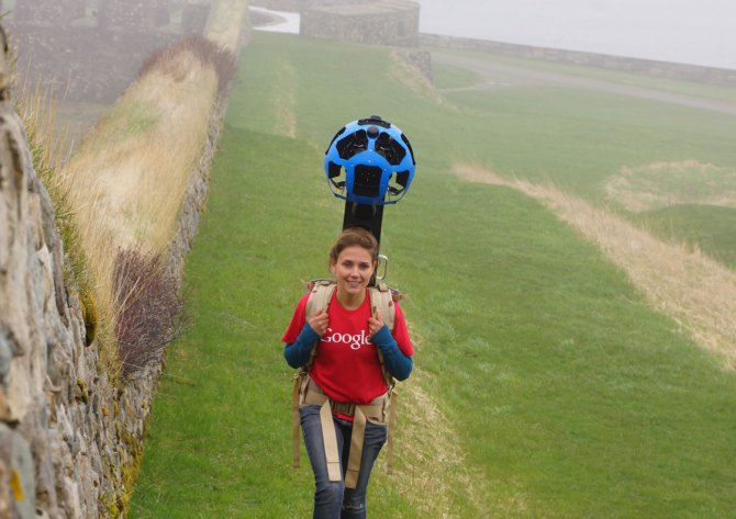 Google has gone to great lengths to drive cars throughout the world in their quest of photographing and adding imagery to their maps. The bulky camera system has been shrunk to a backpack sized device, known as a Trekker, that can be carried along trails and indoors.
