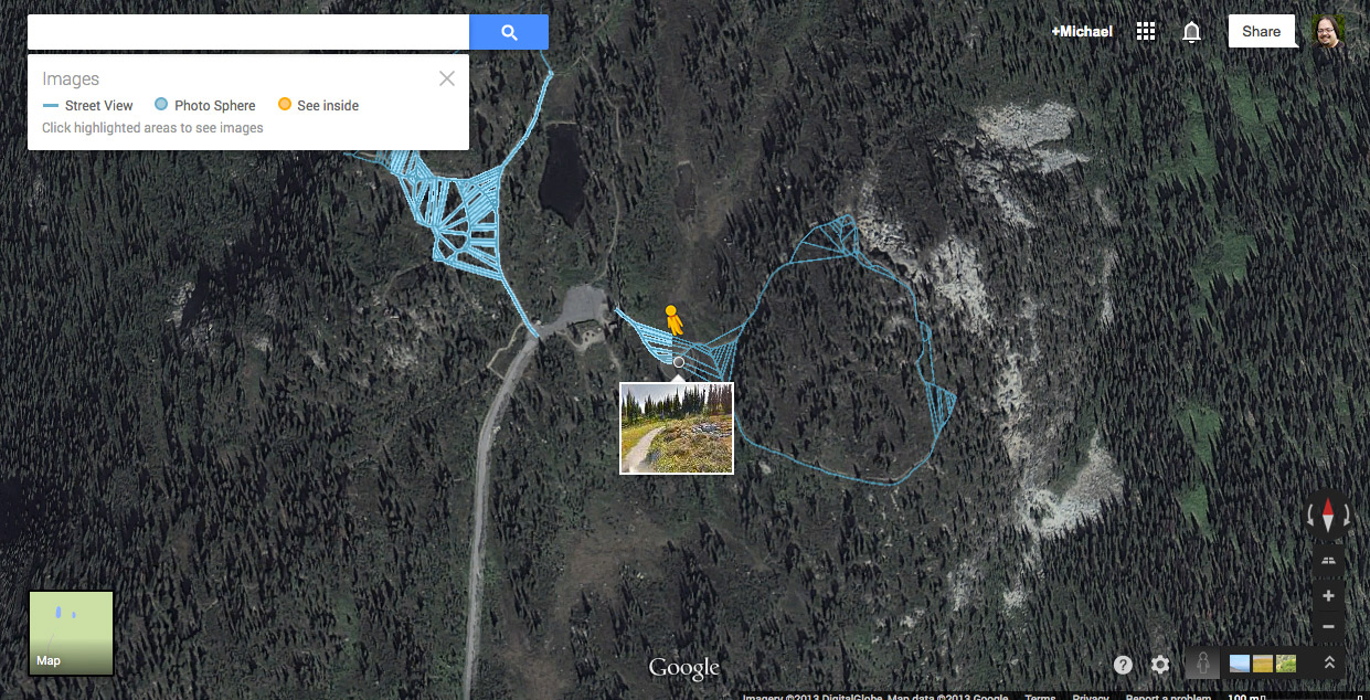I’ve found it a bit challenging to find the actual “street viewed” areas of the parks as it’s a matter of searching for the Parks Canada site and then dragging the Street View Character onto the map, which then causes the mapped areas to appear in blue. The challenge is that in some of the large National Parks that are hundreds of square kilometers, there is only a few kilometers of trail that is available on Street View, so it’s easy to miss.