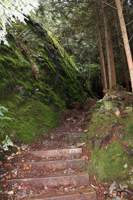 The Velodrome Trail starts from the Barnet Highway, next to the Velodrome, and climbs steeply up 518 stairs (as I counted) before reaching a connector trail that takes you to the totem poles at Horizons. This is a great workout and the top offers a great view looking towards Indian Arm on a clear, sunny day.