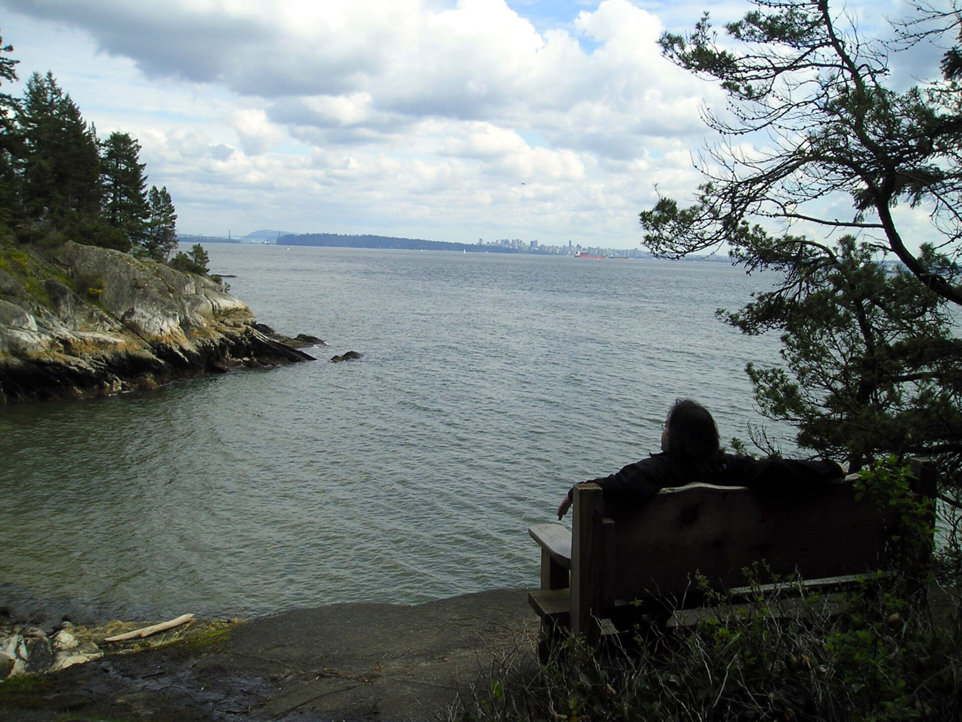 Relaxing on a bench at Lighthouse Park, enjoying the distant view of Vancouver and the Lions Gate Bridge.