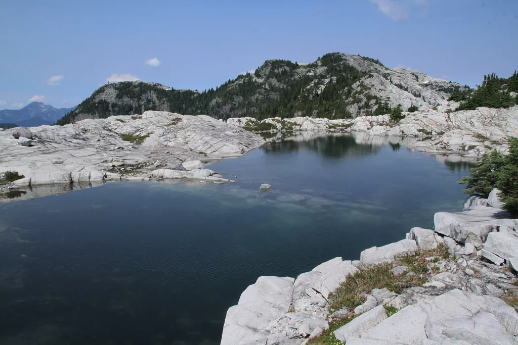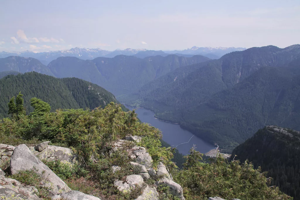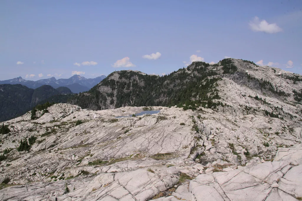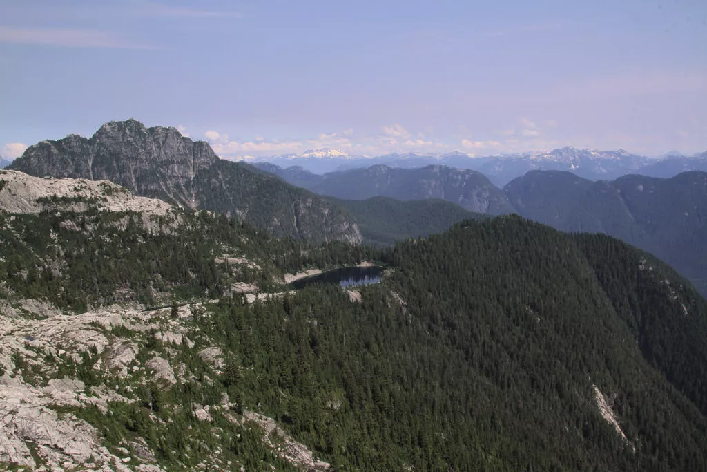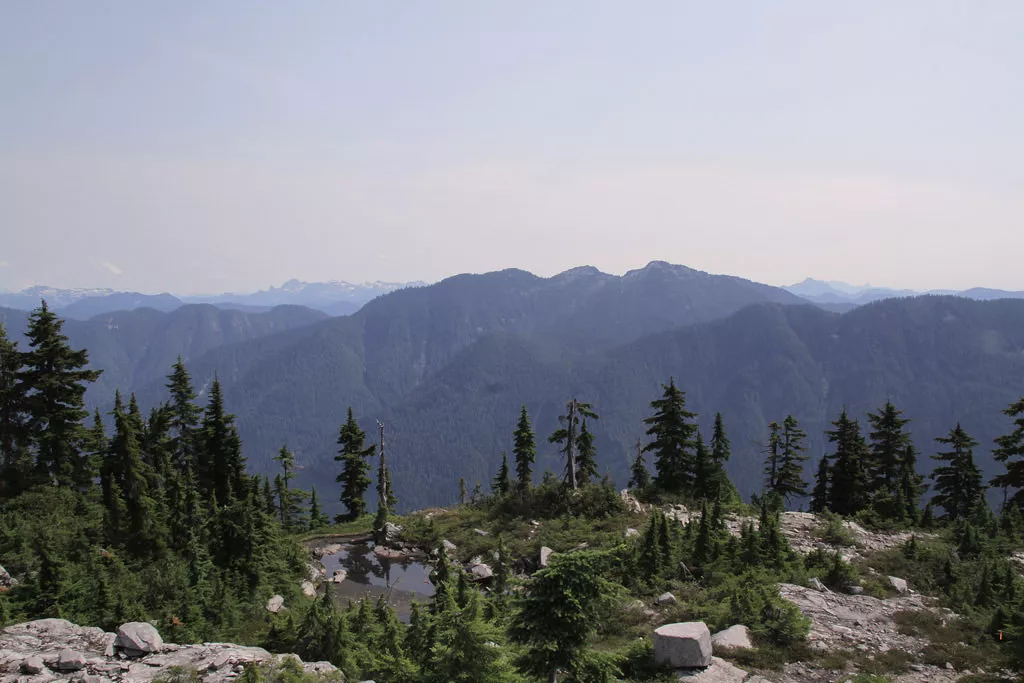 Eventually you will come across a small pond. This is a good spot to take a break before the final ascent. The trail remains rocky and steep to the peak and you can catch glimpses of the surrounding mountains and East Vancouver on a clear day. Soon, the trees begin to thin out and you will be scrambling up the face of the mountain. Keep an eye out for orange ribbons pinned by rocks and tied to small branches that mark the trail leading to the summit. Once you reach the summit enjoy the panoramic views of the surrounding mountains, Cornett Lakes, and Hanes Valley. If you choose to continue further to the nearby lake at the top of Coliseum Mountain do so with care as there is no marked trail to the lake.