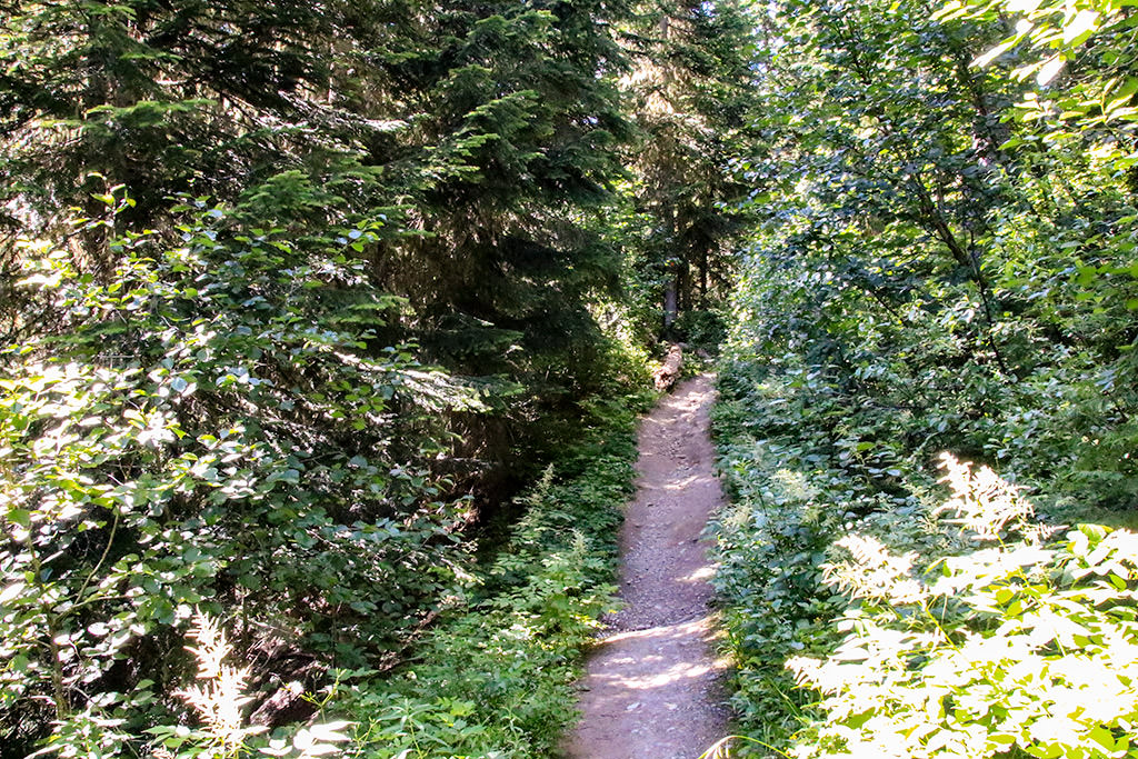 The trail initially climbs quickly but the ascend is more gradual as you continue through the forest, crossing a couple of small wooden bridges. The sound of the rushing creek below can be heard through most of the hike but only small glimpses of it can be seen.
