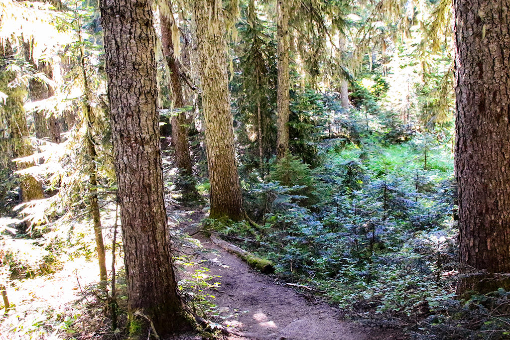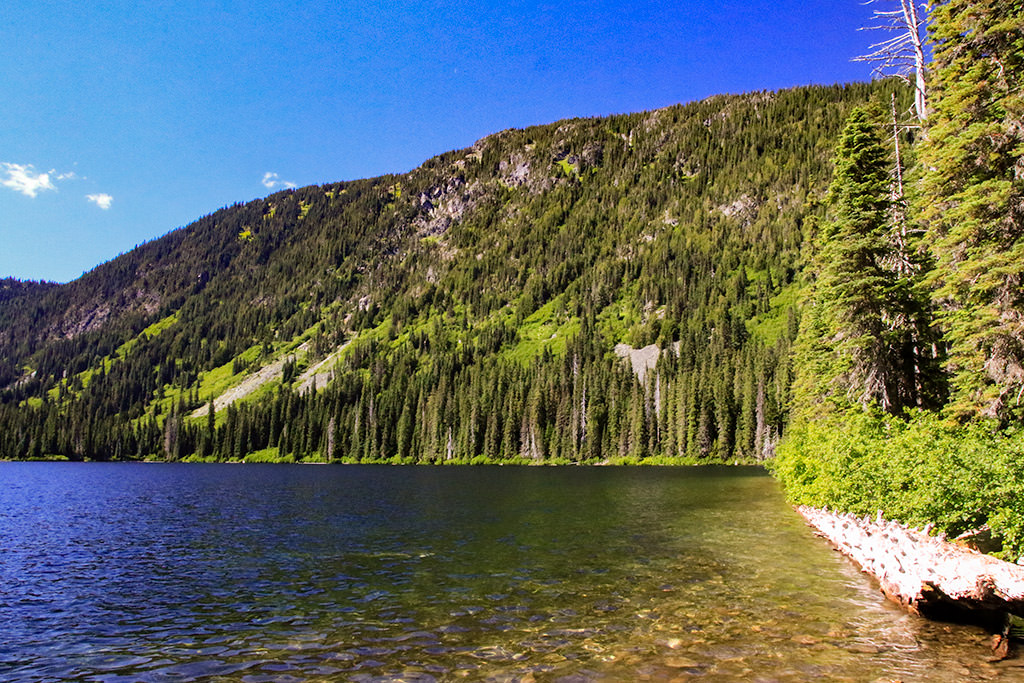 As the trail plateaus, it begins to descend slightly and the first views of the lake can be seen in-between the trees. A few more steps and you arrive at the incredible view of Falls Lake where the towering Nak Peak sits on the left side of the lake.