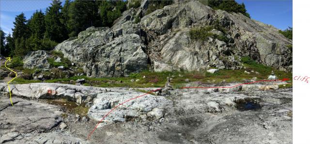 Now about rock piles/cairns. Rock cairn are great trail markers, they're big and look man-made so easy to spot to find the trail when visibility is poor. However people are building their own rock piles in RANDOM places and these can be mistaken for trail cairns. On our hike, there were two rock piles on the bench just below the 3rd peak. In poor visibility if you miss the orange markers for the trail going up to the left and instead follow the cairns to the right you start down a slope that ends in a cliff. Please don't build rock piles along trails when hiking, you just create confusion.