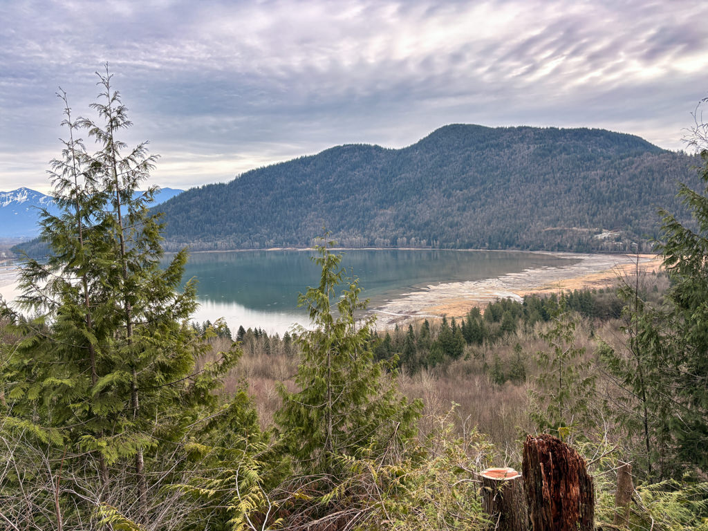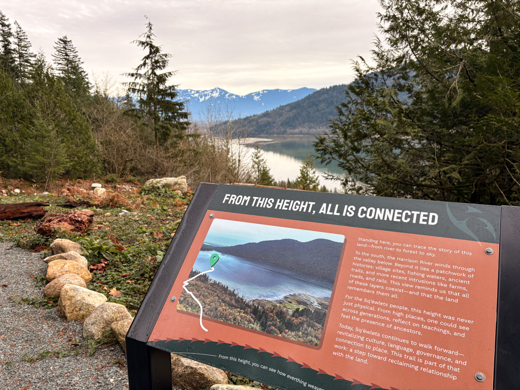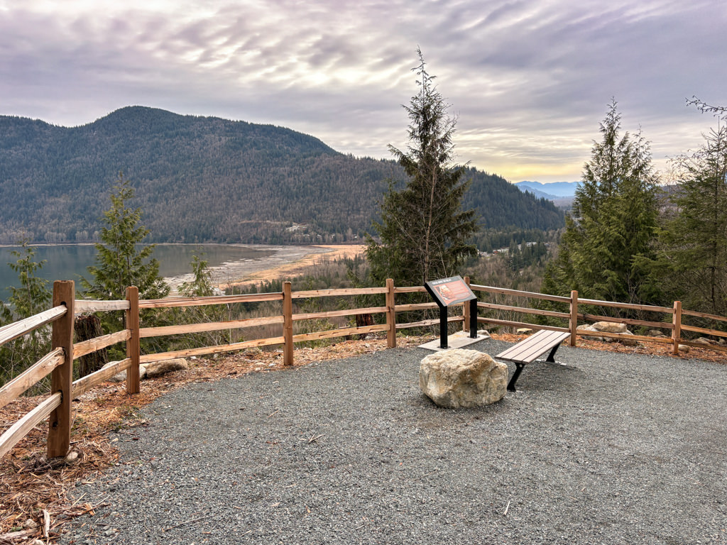 At a sign board, the trail veers to the right before a long straight section climbs to a viewpoint overlooking the Harrison Bay, Harrison River, and across to the Harrison Mills area. At the top, there are two final lookouts with a picnic table, benches, and more information signs.